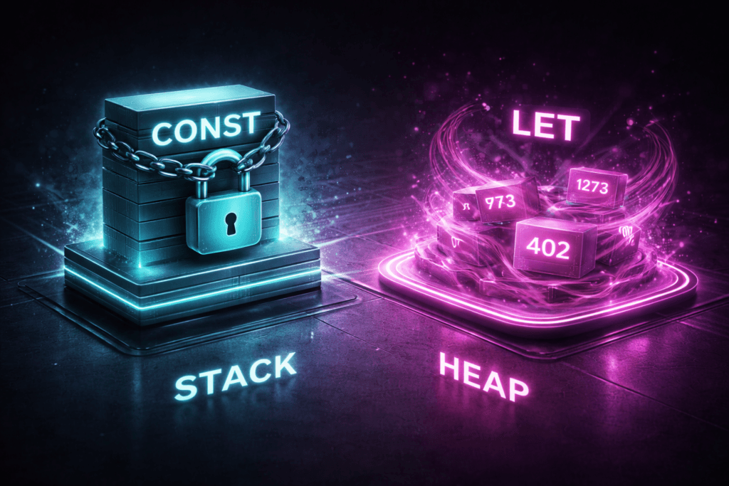 Attenzione: const blocca l’assegnazione, ma non congela il valore se questo è un oggetto o un array. In termini di memoria: protegge l’indirizzo di casa, ma non ti impedisce di cambiare l’arredamento interno.